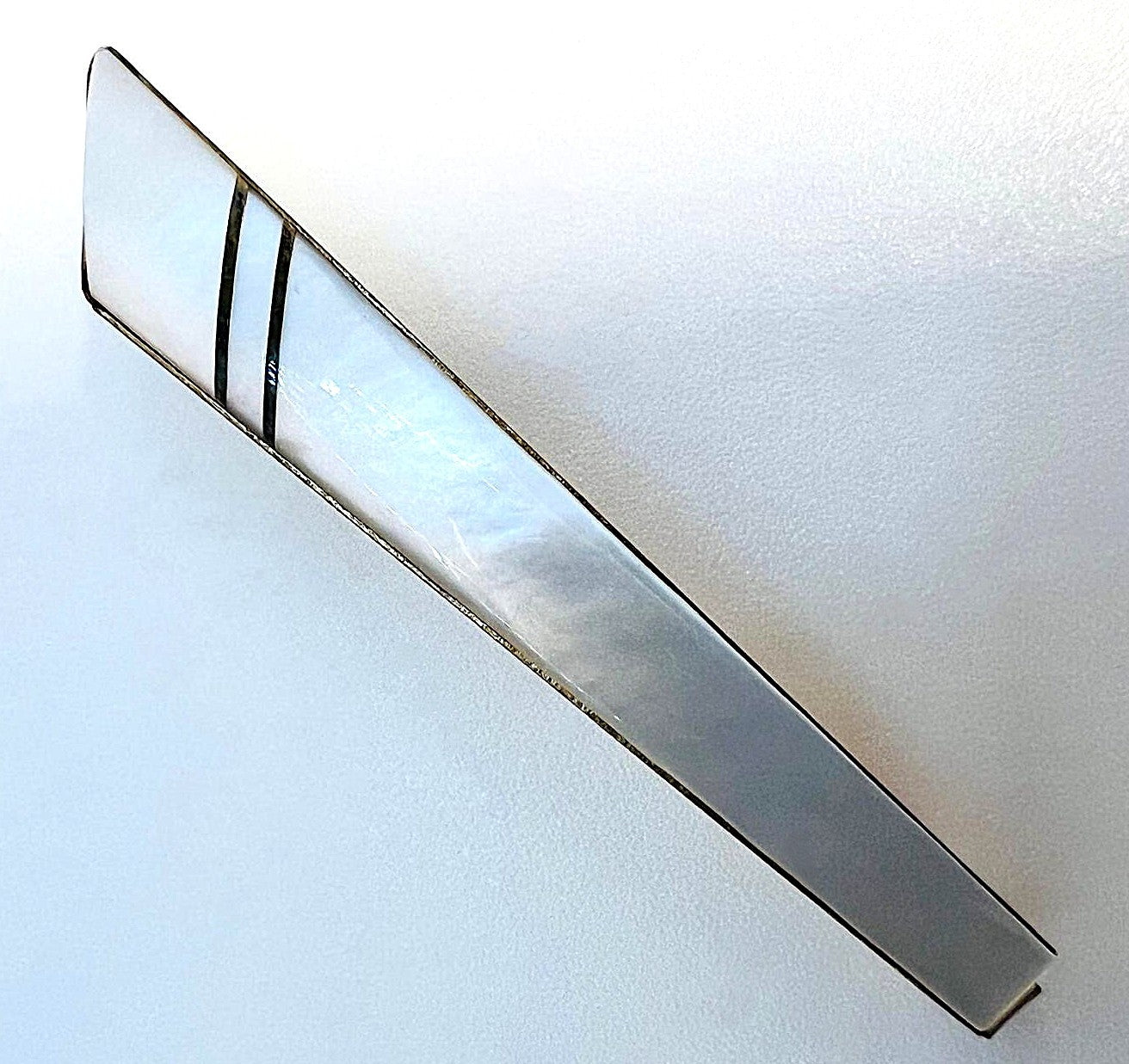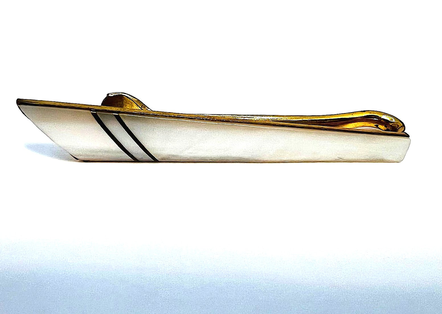 This stylish tie clip from the retro era combines classic design with fine craftsmanship. Crafted from gold-plated brass and adorned with shimmering mother-of-pearl and two black inlay stripes, it adds an elegant touch to any outfit. The clean lines and high-quality material make it a timeless accessory for style-conscious men. Perfect for vintage lovers, collectors, or as an unusual gift. Despite its age, the clip is in excellent condition—a true piece of history with character.