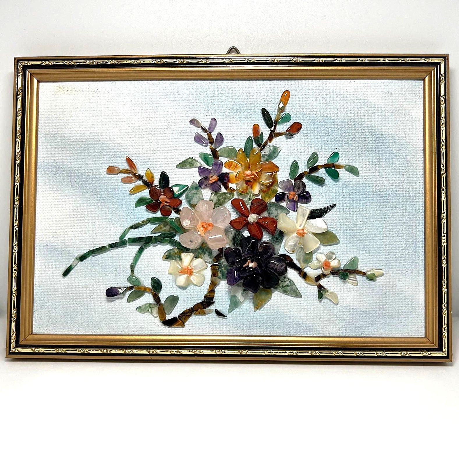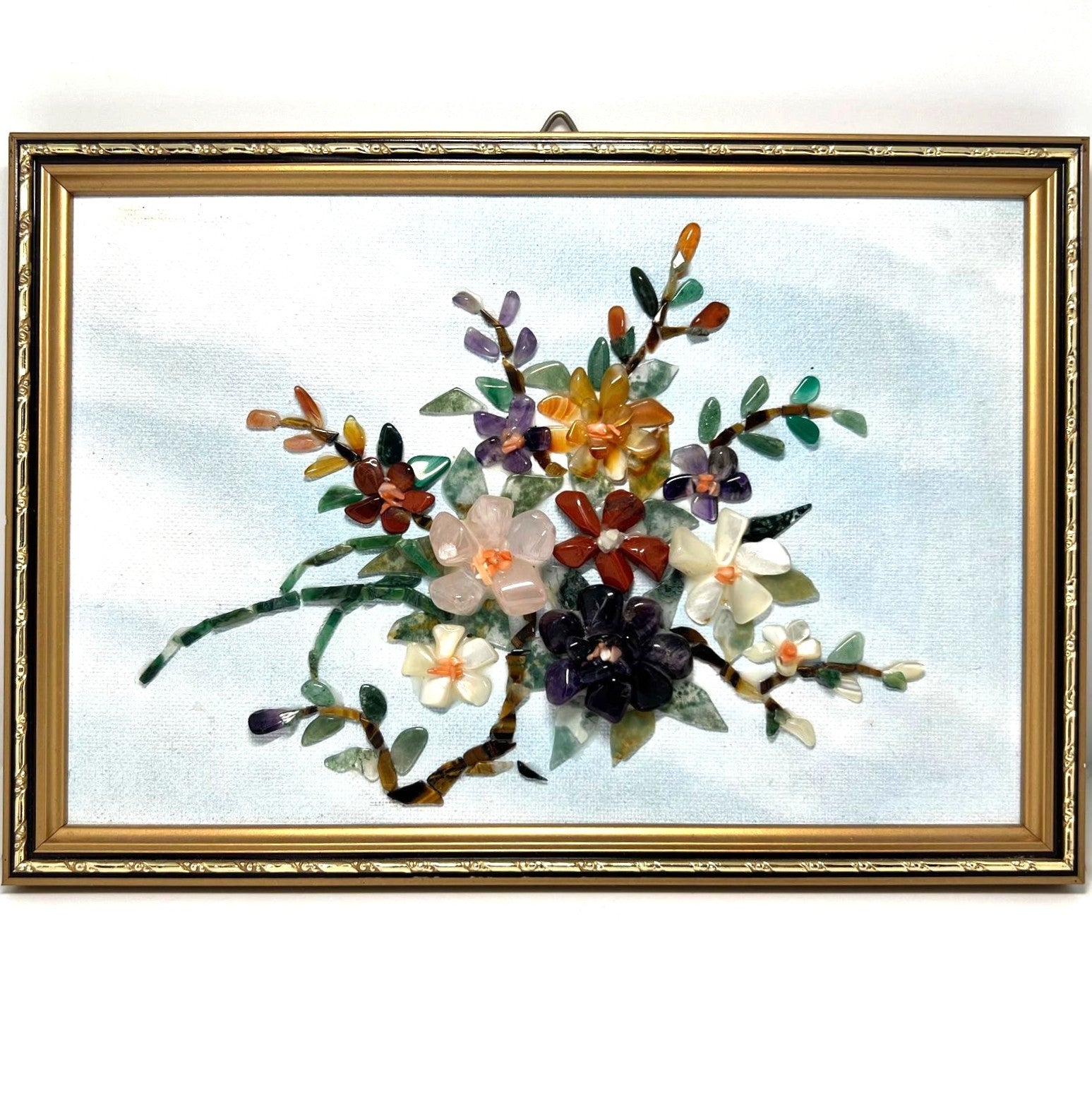 Handgearbeitetes Gemstone-Art-Bild (Singapur 1999): Blüten und Blätter aus echten Schmucksteinen – u. a. Amethyst, Rosenquarz, Aventurin, Moosachat, Karneol, Sodalith, Tigerauge – auf Leinwand montiert, mit Metallrahmen und Hängeöse. Leuchtende Farben, schöne 3D-Tiefe, datiert und mit Steinliste auf der Rückseite. Dekoratives Sammlerstück und perfekte Geschenkidee.